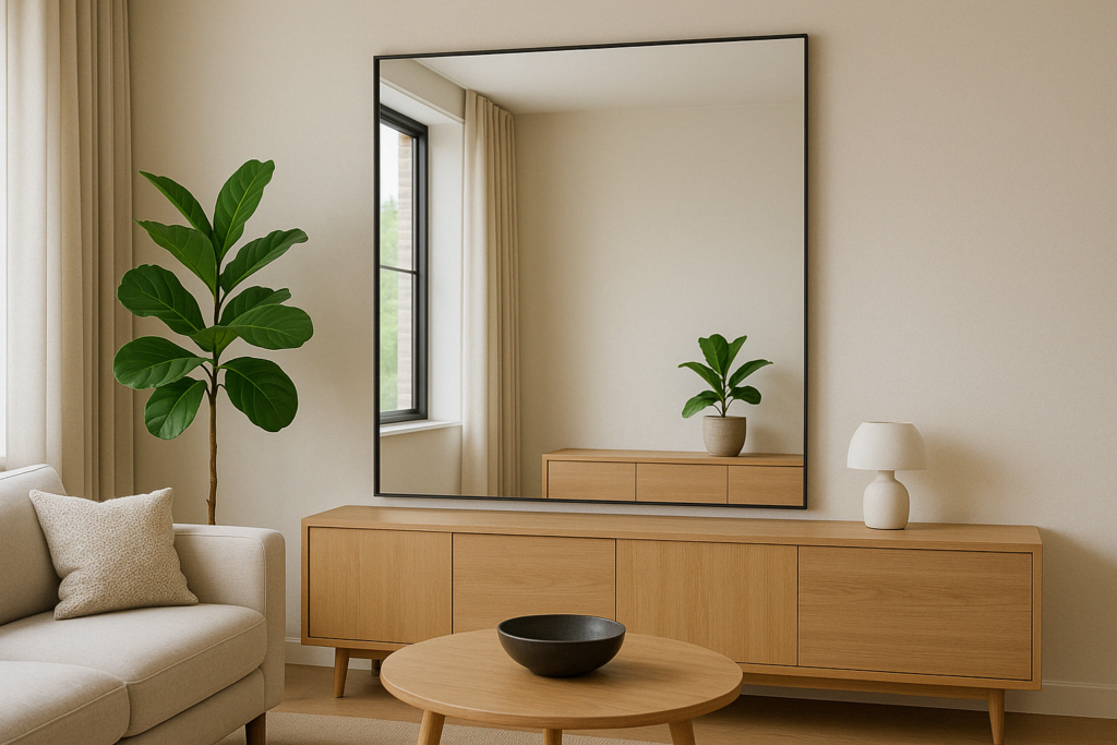Ein geschickt platzierter großer Spiegel kann Ihr Wohnzimmer völlig verändern – er verleiht dem Raum mehr Tiefe, Helligkeit und Eleganz. Dieses einfache Designelement verbessert sowohl die Ästhetik als auch die Funktionalität und macht den Raum offener und einladender.